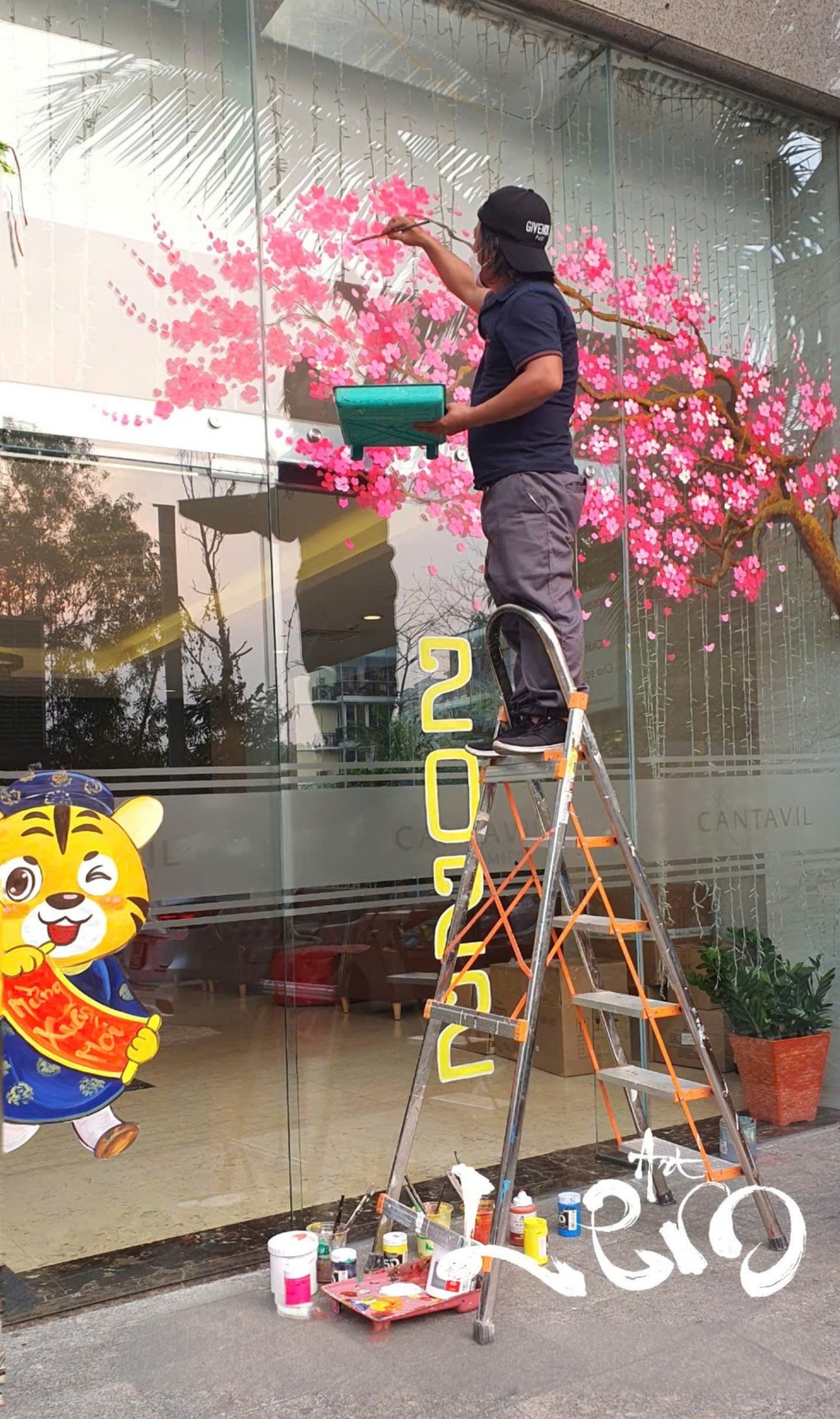 vẽ tranh kính cây mai sảnh văn phòng công ty, toàn nhà tết 2026