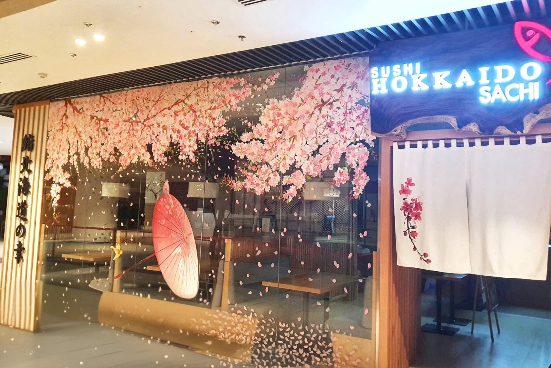 vẽ tranh kính cây mai sảnh văn phòng công ty, toàn nhà tết 2026
