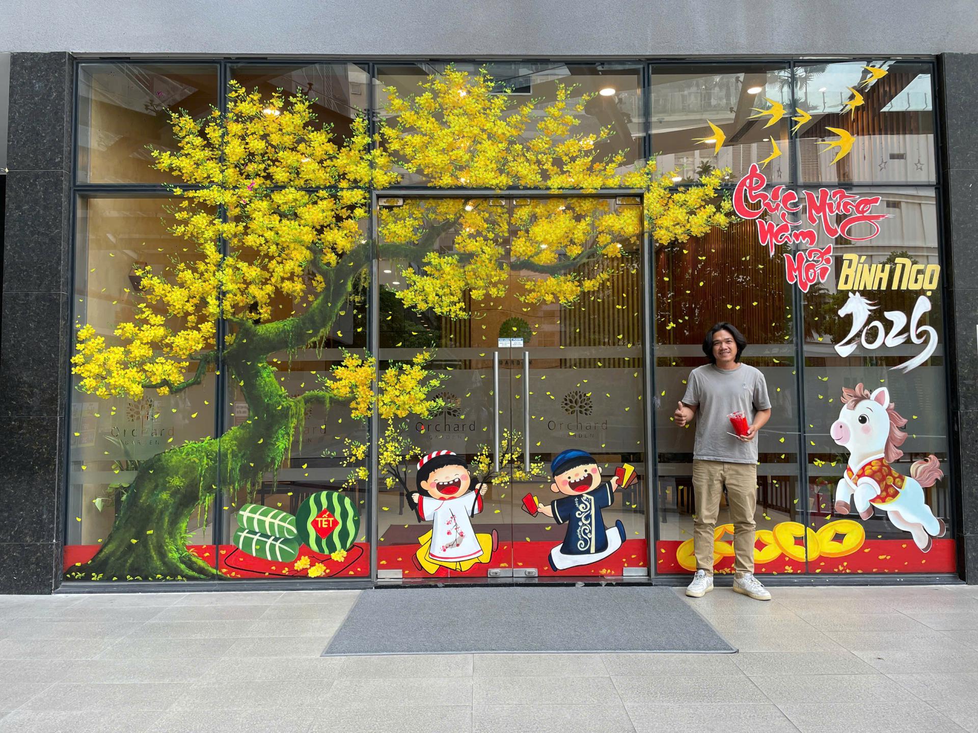 Trong dịp Tết Nguyên Đán, không gian sảnh khách sạn là nơi tạo ấn tượng đầu tiên với du khách trong và ngoài nước. Dịch vụ vẽ tranh cành mai nghệ thuật tại sảnh khách sạn khu vực sân bay Tân Sơn Nhất mang đến vẻ đẹp sang trọng, ấm áp và đậm chất Tết Việt.